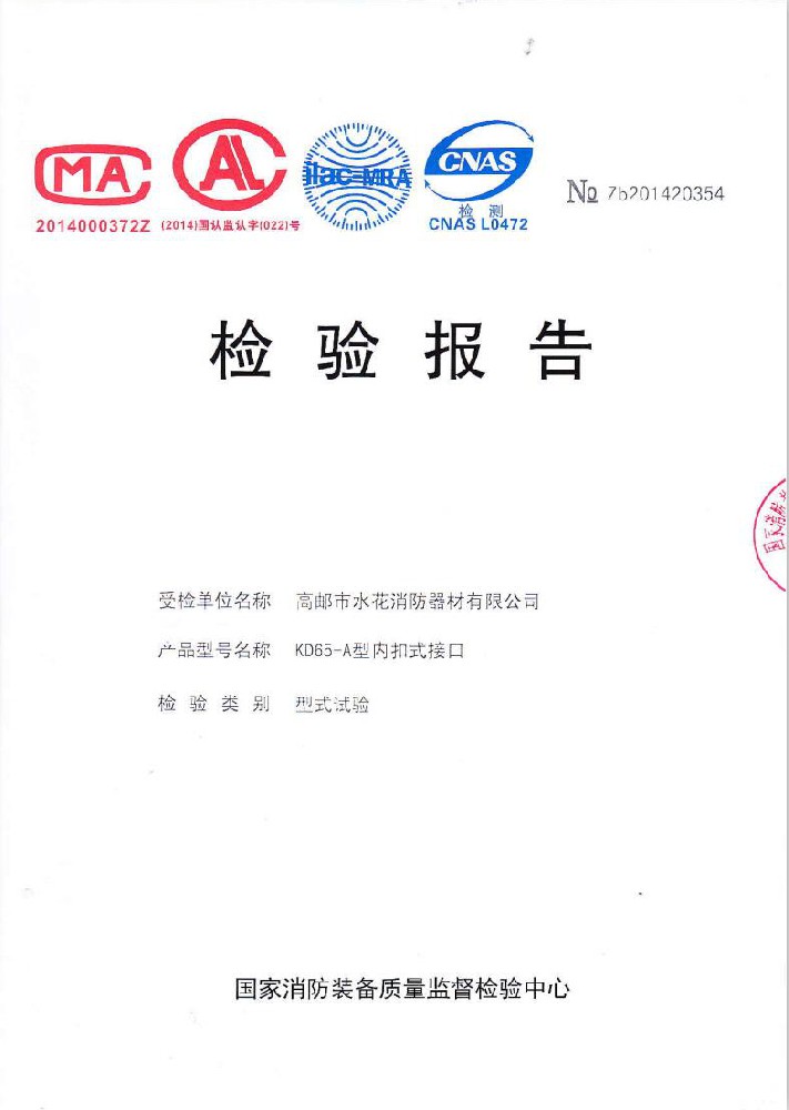 我廠創(chuàng)辦于一九七六年六月,現有職工600人,其中各類技術和管理人員68人。擁有固定資產5000萬元,占地面積35000多平方米,建筑面積25000多平方米。建立了完善的質量體系,取得多種“計量合格確認證書”,并成為江蘇及多省的消防協會會員單位。工廠技術力量雄厚,生產和檢測設備齊全,工藝先進。生產“水花”牌水帶接口: KDK65, KD65,KY65,KN65。消防水槍: QZG3.5/7.5, QZ3.5/7.5,QP8/0.7Z泡沫水槍。室內消火栓: SN65, SNW65-I,SNZ65, SNZW65-I。 消防軟管卷盤JPS0.8-19/25。生產的“郵花”牌,消防有襯里水帶:65-8、10、 13、 16、20、 25型; 80-16、 20、25型。水帶接口: KD50、65; KY50、65;KN65。消防水槍: Q2Z3.5/7.5、 5。 室內消火栓: SN65, SNW65-I, SNZ65, SNZW65-I。 并于二零一五年五月通過公安部消防產品合格評定中心3C換版檢驗,獲得以上產品所有的強制認證證書,準予生產和銷售,產品行銷全國各地,深受廣大用戶好評。